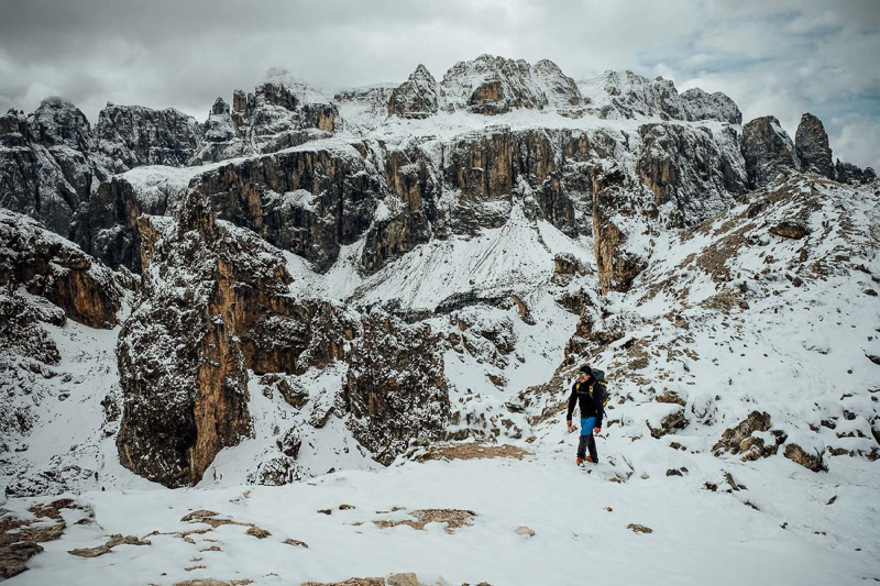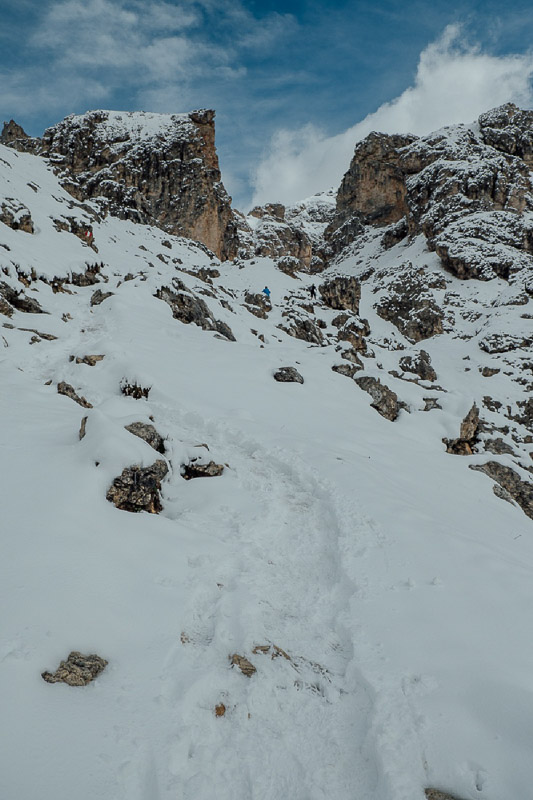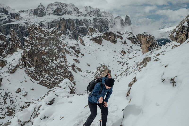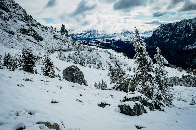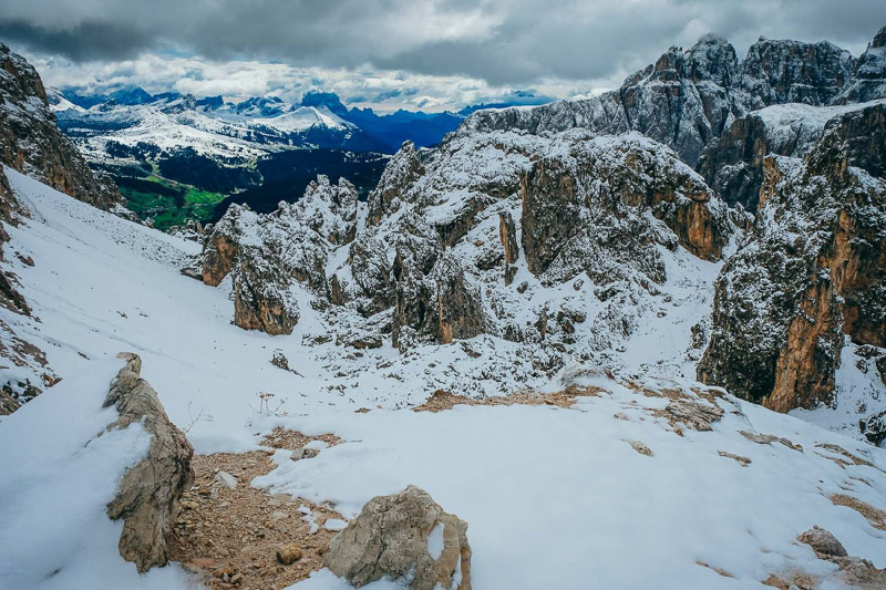 Bewertung: Bereits im September kann dort Schnee liegen (Grödel mitnehmen). Wanderstöcke sind von Vorteil. Kurzer, aber teils steiler Anstieg bis zu den Cirspitzen. Von St. Christina ging es mit der Seilbahn hoch zur Dantercepies-Bergstation. Da es Anfang September war, lag hier bereits Schnee. Es fanden sich noch einige MTBer, die die Trails am Dantercepies runterrauschten. Wir ließen uns von der Bergkulisse beeindrucken, bestaunten das Grödner Joch und den Sellastock. Danach ging es in Richtung Jimmyhütte auf dem Wanderweg Nr. 2 weiter. Irgendwann bogen wir links steil nach oben ab, doch nicht die Höhenmeter waren an diesem Tag das anstrengende, sondern der zuerst nicht erkennbare Weg durch Schnee und Eis. Zwischen den Cirspitzen hindurch kämpfen wir uns Schritt für Schritt weiter nach oben. Der Wind ist eisig, der Weg wird schmäler und das Gekraxel beginnt, ehe wir zwischen Meterhohen Felstürmen auf der Passhöhe ankommen und einen Blick auf das Chedultal werfen. Da wir aufgrund des Wetters keine Risiken eingehen wollten, machten wir uns auf den Rückweg.