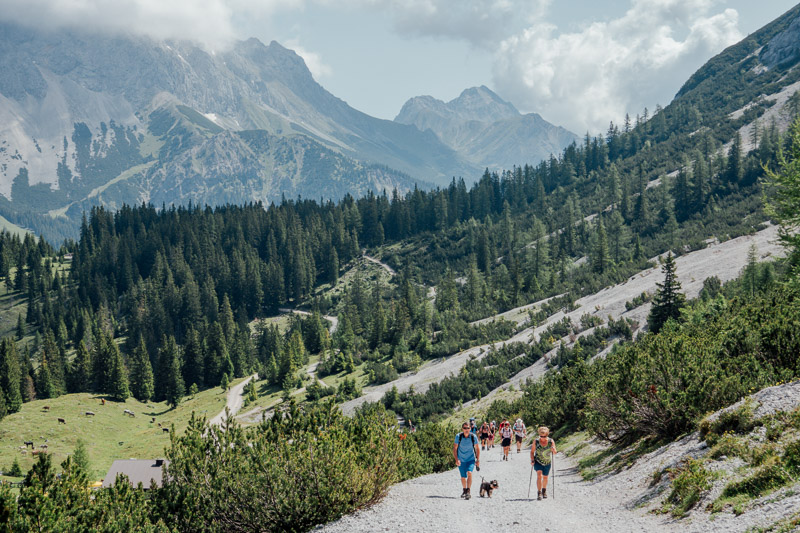 Tourenverlauf: Ehrwalder Almbahn – Gasthof Alpenglüh’n – Koatiger Weg – Brendlkar-Seeben Alm – Brendlkar – Seebenalm – Talblick Stempelstelle – Seebensee –Igelsee – Gaisbachtal –