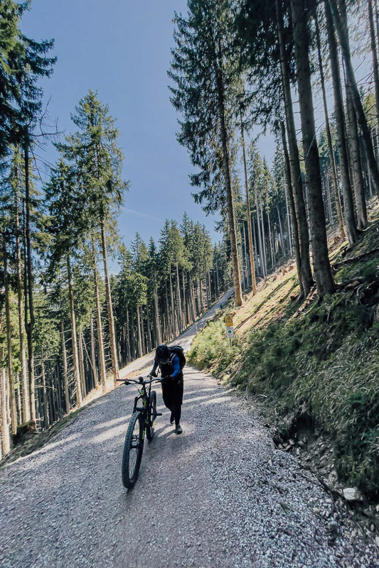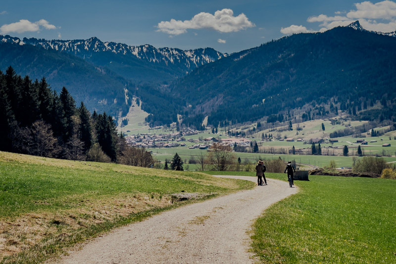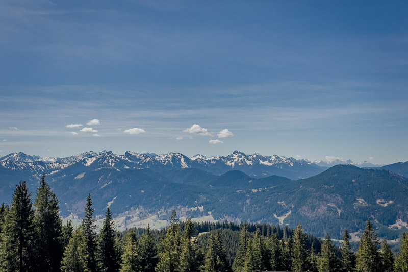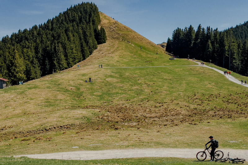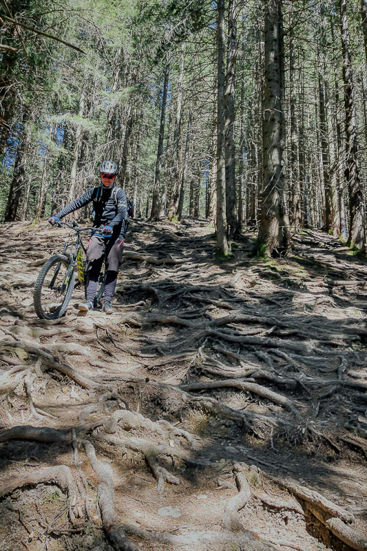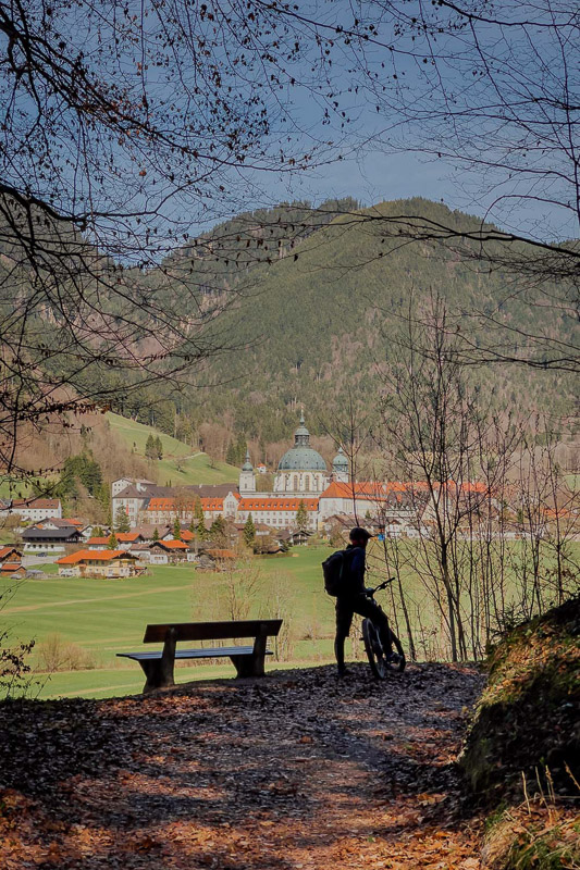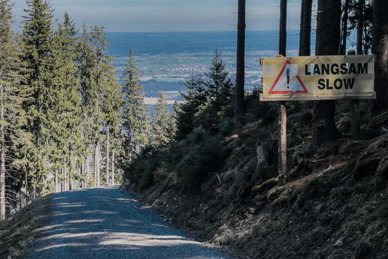 Bewertung: Diese abwechslungsreiche und auch landschaftlich einmalige Route bietet zahlreiche Highlights. Anfangs mit zunehmend leichter Steigung, folgt die erste Schiebepassage in Bad Kohlgrub neben einem ausgetrockneten Bachbett. Der Aufstieg zum Zeitberg (Hörnlehütte) auf Schotter wird steiler, vor allem der letzte Kilometer ist für viele nur schiebend zu bewältigen (als wir diese fuhren lag teilweise noch Schnee). Dort oben bietet sich ein 360-Grad-Rundumblick auf das Ammergebirge. Die Abfahrt währt danach nur kurz. Hinter dem Sommerweg folgt links ein Pfad in den Wald, dieser ist so verwurzelt, dass man aufgrund der Steilheit auch nur schiebend vorankommt. Fahrer mit S3-S4-Erfahrung dürften hier ihre Freude haben. Danach geht es weiter auf Forstwegen nach Wurmansau. Hier folgt ein kürzerer Abschnitt schiebend aufgrund Durchfahrtsverbot. Danach geht es Richtung Oberammergau, über den Romanshöheweg, der mit S1 ausgezeichnet ist, weiter nach Ettal und ein kurzes Stück auf der B23, ehe es nochmal bei der Abfahrt nach Oberau Konzentration fordert. Das auch wenn nur kurze Stück ist steil und sehr schottrig.