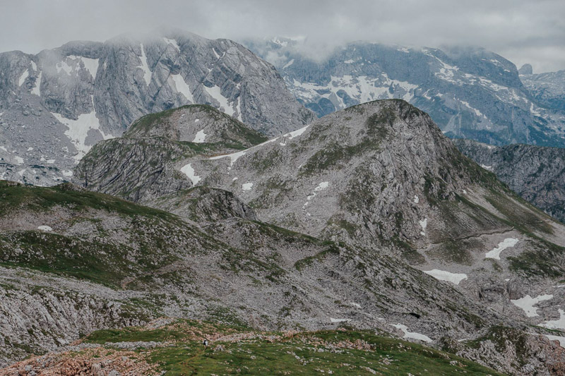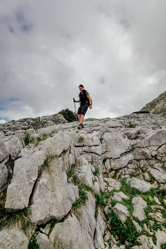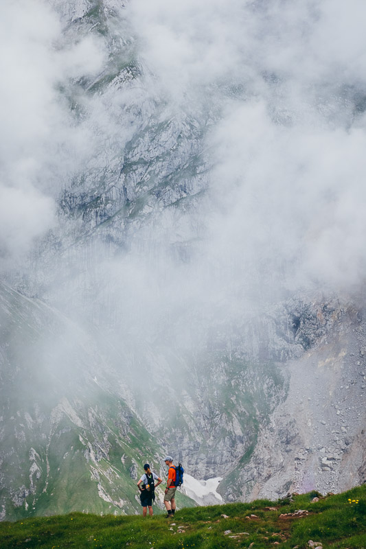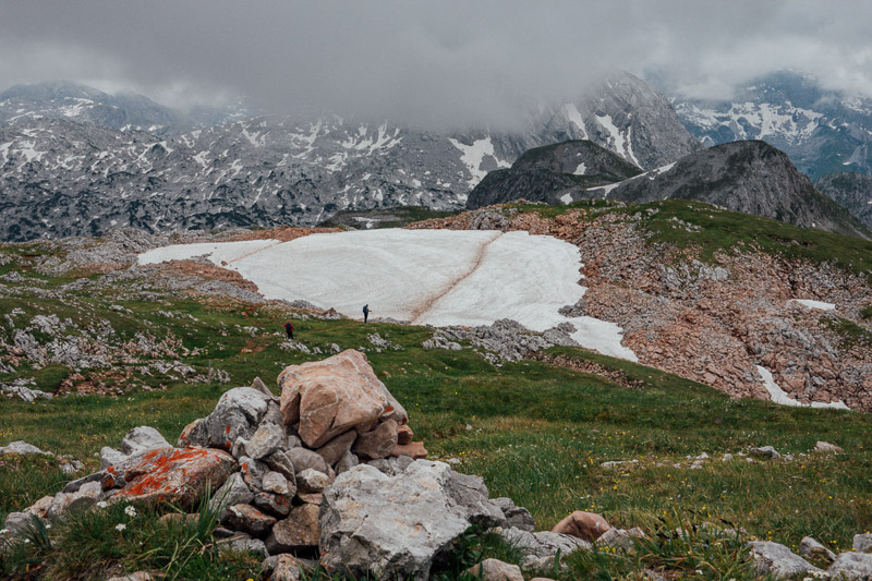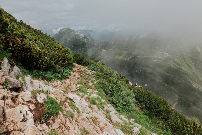 Bewertung: Die Wege zum Schneibstein sind bis kurz vor Gipfelankunft sehr gut zu gehen. Auf knappen 8 km müssen 1000 Hm überwunden werden. Am Carl-von-Stahl-Haus, das direkt am Torrener Joch und unterhalb des Schneibsteins liegt, thronen die imposanten Felswände der Berchtesgadener Alpen rundum. Kurz vor dem Schneibstein wird das Gelände unwegiger und felsiger, leichte Kraxelei folgt, teils über Latschenkiefern und je näher man dem Gipfel kommt, umso größer wurde die Felswüste. Das Gipfelplateau selbst ist flach und weitläufig. Der 360 Grad Rundumblick blieb uns an diesem Tag verwehrt, weil immer wieder Nebelschwaden aufzogen. Doch auch diese reichten um Blicke auf Hohes Brett, Hoher Göll, Dachstein, Hagengebirge, Hochkönig, Steinernes Meer mit Großem Hundstod sowie Watzmann und Hochkalter zu erhaschen. Auf dem Weg zum Seeleinsee bahnt man sich, je nach Wetterlage, durch Schneefelder. Ab der Windscharte folgt erneut Kraxelei und bis zur Priesbergalm ist der Untergrund Fels- und Steindurchsetzt.