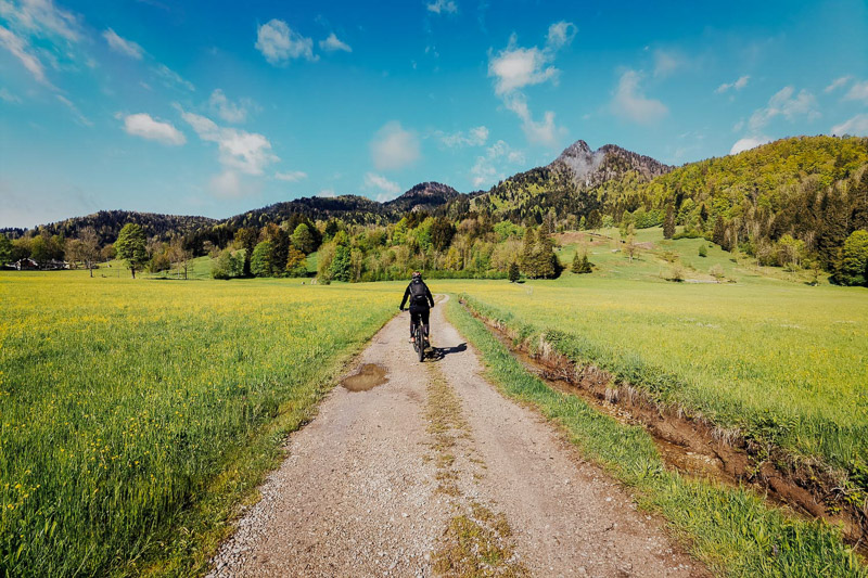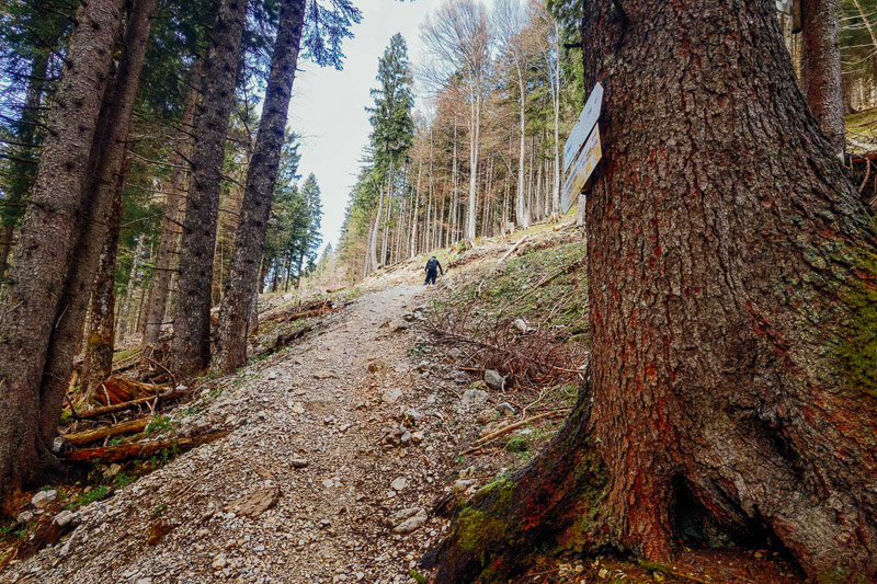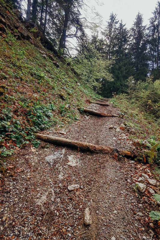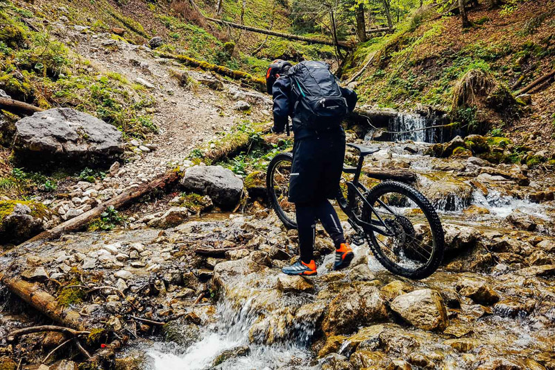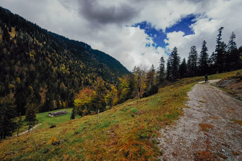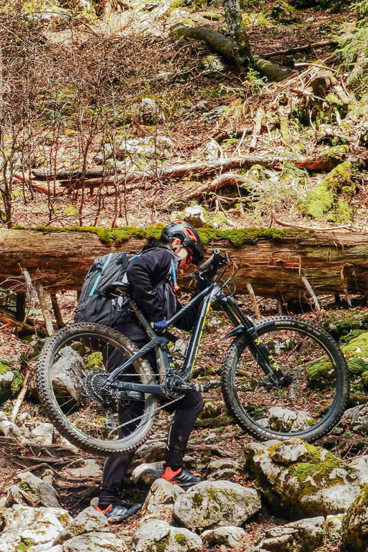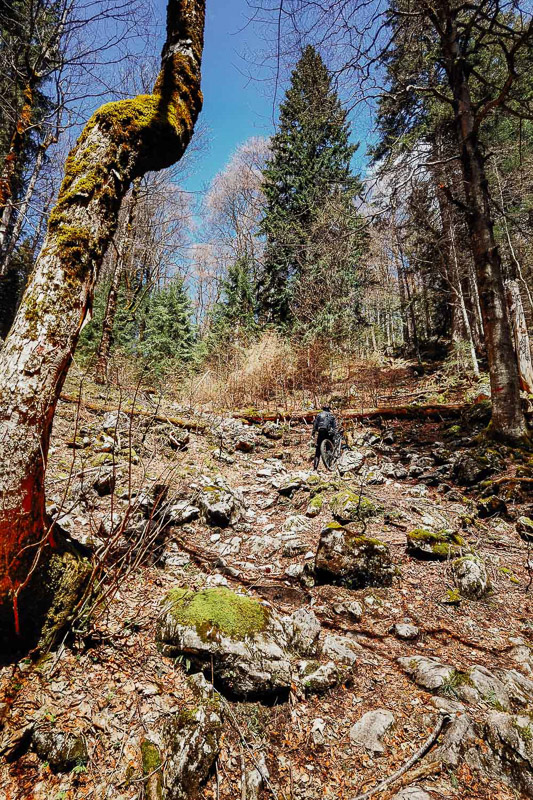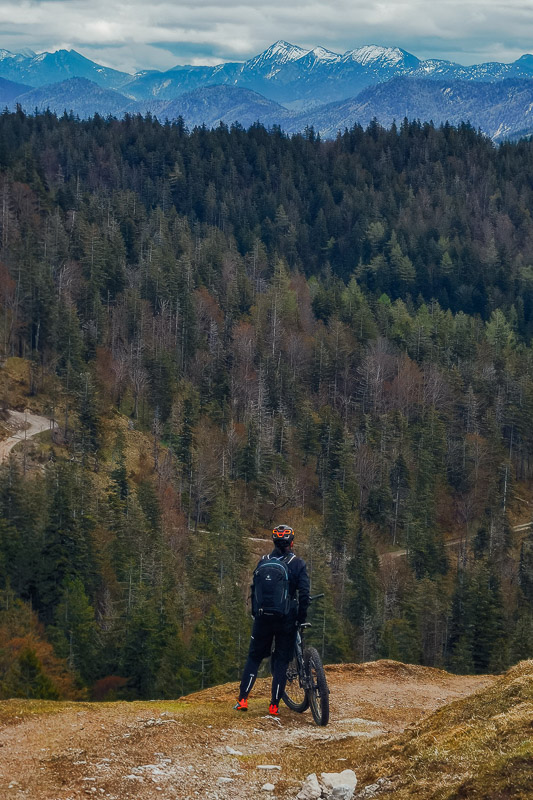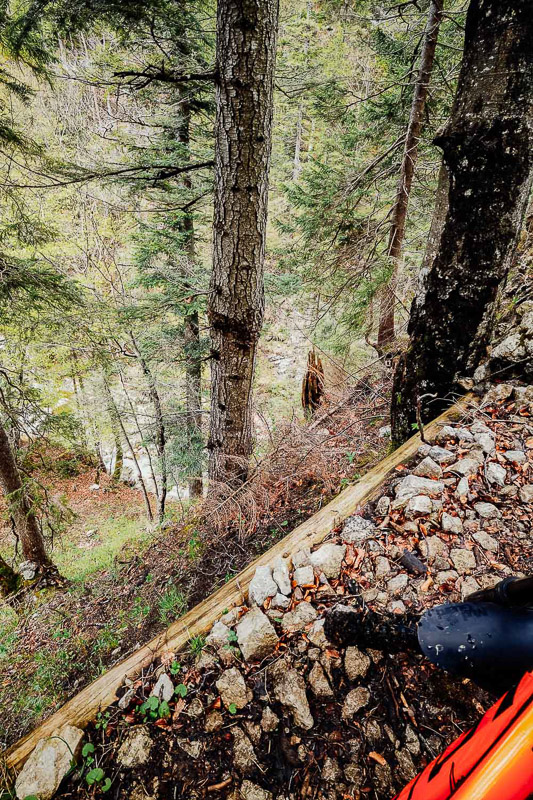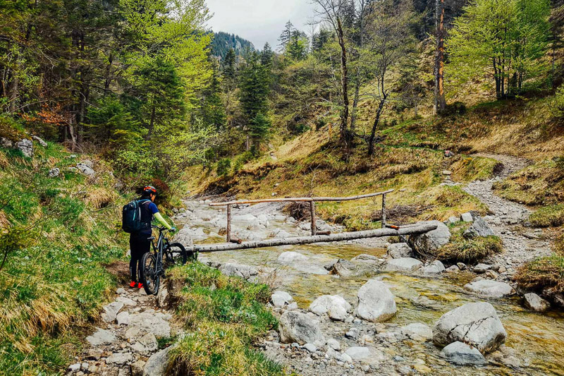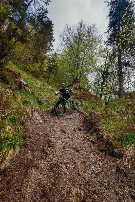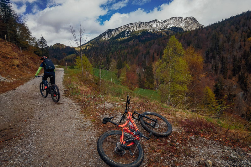 Bewertung: Abwechslungsreich, sowohl konditionell (steile Auf- und Abstiege als auch längere Tragepassage, deshalb nicht E-Bike geeignet!) als auch technisch herausfordernd (S1-S3-Trails vorhanden). Über Asphalt- und Forstwege geht der Untergrund in einen Flowtrail über, der an einigen Stellen etwas enger, felsdurchsetzt oder mit Behelfsbrücken versiert ist. Kurz vor Querung des Schwarzbaches, den man über die „Maicher Bridge“ (einer aus Holzstämmen zusammengebauten und etwas wackligen, engen Konstruktion) quert, kommt zuvor ein sehr steiles Abwärtsstück, das wir vorsichtshalber geschoben haben. Danach geht es auf einem kurzen Schiebestück bergauf zur Oberen Orterer Alm. Am Langenecksattel angekommen führen die nächsten Kilometer durchweg über Schotter. Am Übergang zur Glaswandscharte muss das Rad geschultert werden, hier braucht man ca. 15-20 Minuten bergauf um die 200 Höhenmeter auf dem kurzen Stück zu meistern. Nach der Gabriel-Alm biegt man in den Jäger-Steig ab. Schieben ist hier desöfteren angesagt, u.a. Bachquerung und felsdurchsetzte Stücke ab- und aufwärts, ehe man auf den Forstweg zurück gelangt.