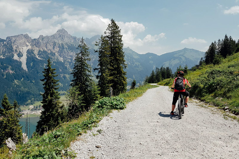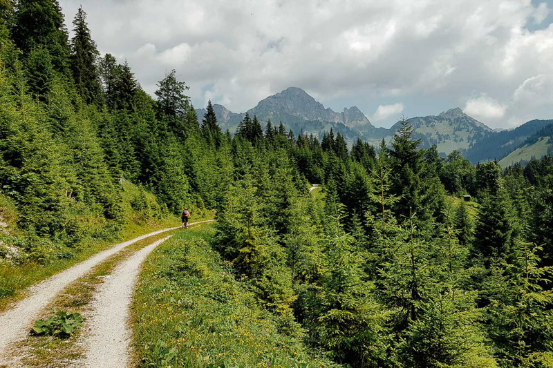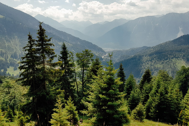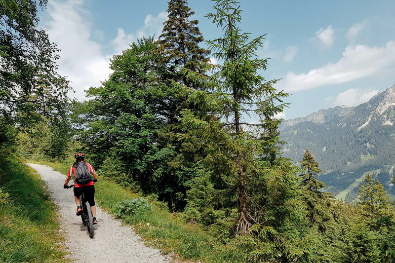 Bewertung: Überwiegend auf Forst- und Höhenwegen sowie Pfaden führt die Tour an mehreren Einkehrmöglichkeiten vorbei. Da es auch einen Bahnbetrieb ab der Krinnenalpe gibt, muss man auf Wanderer achten. Die Steigung ist angenehm, steiler wird es auf dem Höhenweg Meraner Steig bzw. einem steinigen Wiesenpfad nach der Krinnenalpe. Umso höher man steigt, umso beeindruckender werden die Aussichten auf die Tannheimer Berge und den Haldensee. Die Abfahrt erfolgt auf Schotterwegen.