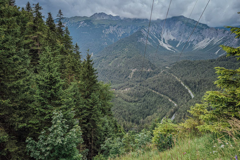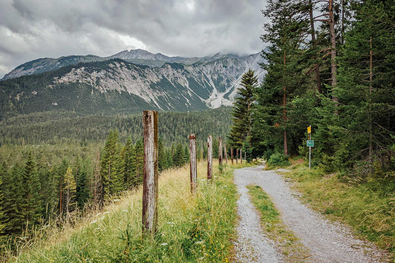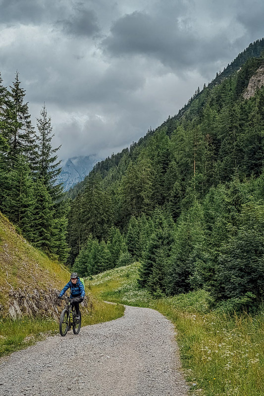 Bewertung: Mit Start in Garmisch führte der Weg bei Wolkenverhangenem Wetter über Grainau zum Eibsee. Diesen umrundeten wir zu Dreiviertel und bogen dann zur steilen Auffahrt zur Hochthörlehütte ab (500 Hm auf 5 km) und diese zog sich in die Länge. Mit Ankunft an der Hütte setzte der Regen ein, da kam ein Aufenthalt im Inneren der urigen Hütte (Mittwoch Ruhetag!) gelegen. Anschließend hieß es rollen lassen, überwiegend auf Asphalt, bis Obermoos und nach Ehrwald. Richtung Biberwier verlief der Untergrund wieder mehr auf Waldboden, mit kurzem Abstecher durch den Lärchenwald, ehe es über den Panoramahöhenweg nach Biberwier zum Weißensee und auf den Fernpass mit erneutem Anstieg ging. Die Abfahrt belohnte für die Mühen. Weiter führte der Weg zum Schloss Fernstein und dem alten Karrenweg, bevor es durch das Gurgltal über Nassereith, Strad zum heutigen Endziel nach Imst auf Forst- und Schotterwegen ging.