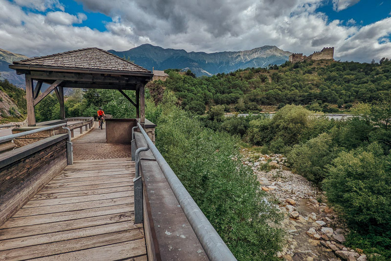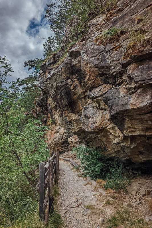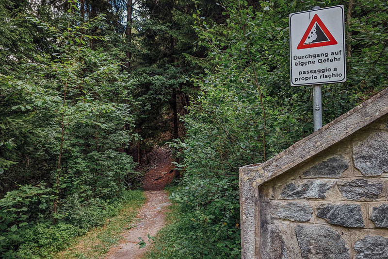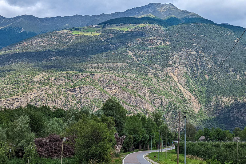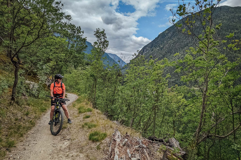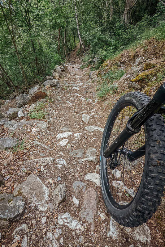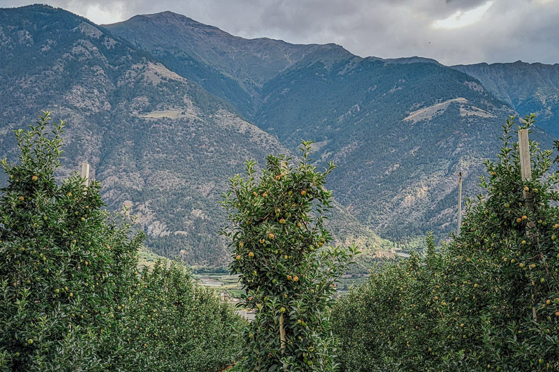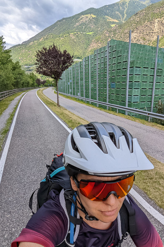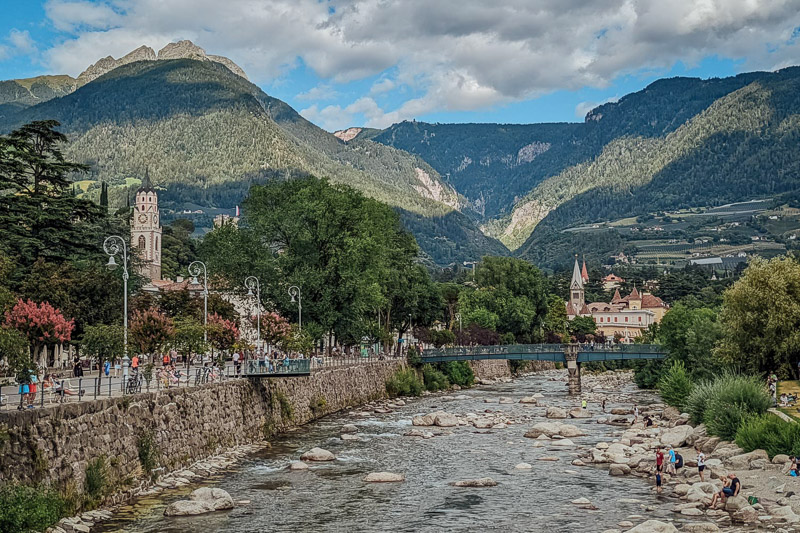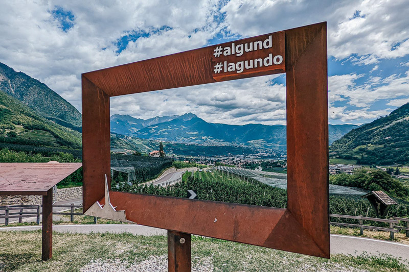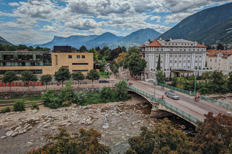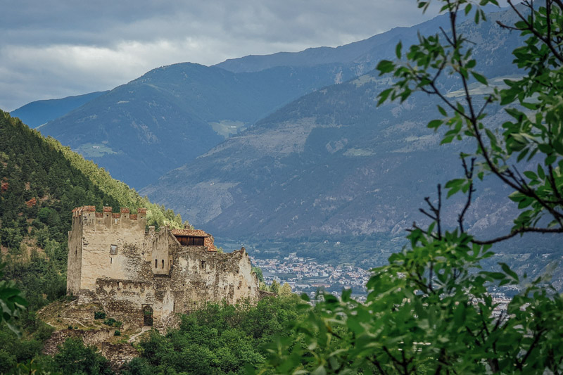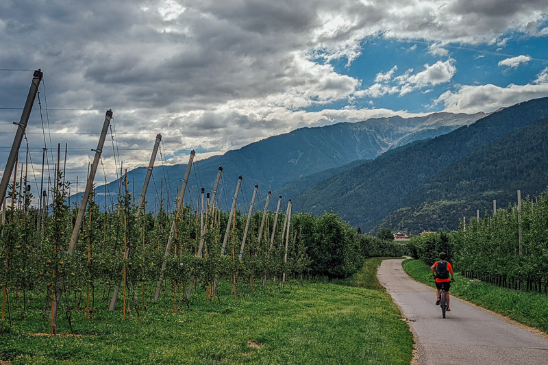 Bewertung: Eine entspannte Tour lag vor uns, von Schlanders ins wunderschöne Meran! Zuerst folgten wir noch der Via Claudia Augusta, anfangs begleitet von ersten Radelgruppen, die frühzeitig starteten. Da hallte es im Sekundentakt “Morgen” durch die Apfelplantagen, bis wir nach Morter abzweigten, einem kleinen Dorf am Rande des Nationalparks Stilfserjoch, mit zwei eindrucksvollen Burgruinen, Obermontani und Untermontani, die wir später auch von oben wieder sehen sollten. Über die Hauptstraße bogen wir nach einigen Kilometern in einen unscheinbaren, aber steilen, Pfad nach unten zur Kapelle der Heiligen Barbara ein. Auf dem Waalweg (Waale sind künstlich angelegte Bewässerungskanäle. Die Waalwege wurden als meist schmale Stege zur Instandhaltung und Pflege eines Waals errichtet) Richtung Latsch wurde der schmale Trail steiniger und wurzeliger. An den teils steil herabfallenden Felswänden wurde es eng, aber dafür hatte man gigantische Ausblicke auf das Etschtal. Nachdem wir Latsch erreicht hatten, ging es wieder auf Teer entlang der Etsch immer geradewegs nach Meran. Die Kilometer purzelten, wir passierten Naturns und trafen bald am Meraner Stuhl bei Algund ein, einem Aussichtsplateau, auf dem Meran einem quasi zu Füßen liegt. Die letzten 5 Kilometer ins Zentrum war ausrollen angesagt und den restlichen Tag bei bestem Wetter in der zweitgrößten Stadt Südtirols zu genießen.